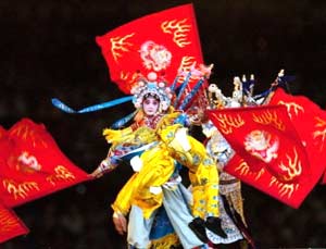 Después de que el alcalde de Beijing, Wang Qishan, recibió la bandera olímpica, la delegación china presentó un espectacular número musical, con un grupo de chicas coristas, luego otro de hombres y mujeres ejecutando ejercicios de artes marciales al compás de la música, para terminar con otro grupo que realizó vistosas maniobras con banderolas, mientras que en el pasarela superior desfilaban personajes con farolas de colores encendidas.