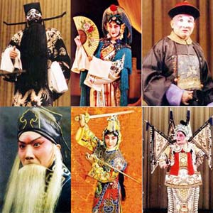 Los papeles de la ópera de Beijing se dividen por sexos, edades y belleza o fealdad en sheng, dan, jing y chou. El sheng es un hombre positivo; el dan es una mujer positiva también; el jing es un personaje masculino secundario, de carácter franco; y el chou es un personaje humorístico y divertido o negativo. Cada papel posee un maquillaje y atuendo propios, y para el espectador basta con echarle una mirada para saber quién es cuando sale a escena.