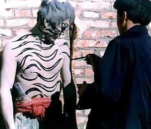 Durante el primer mes lunar (que cae entre enero y febrero del calendario gregoriano), la meseta Qinghai-Tíbet está en pleno invierno y nadie siente el calor del sol que brilla en el cielo. Pero los muchachos escogidos se desnudan de la cintura arriba, levantan las perneras, se dejan pintar con hollín de olla rayas de la piel del tigre en el rostro, el cuerpo y las extremidades por los pintores de la aldea y se atan los cabellos como el pelo erizado del tigre iracundo. Portan cuchillas cortas y largas en la faja y ramas de árbol gruesas provistas de papel blanco de conjuros en las manos. Ya listos los tigres sagrados, llamados wutus, el lawa (sacerdote), cucurucho de cinco budas en la cabeza, los conduce a arrodillarse ante las imágenes en el Templo del Dios de la Monta?a. El lawa toca el tambor y recita oraciones rogando al dios amparar la aldea y autorizar a los wutus a exorcizar a las familias. Ahora el superior del templo les dan de beber aguardiente a los wutus sin cesar para que resistan el frío y entren en estado. Tras explicar el lawa la orden del dios, los wutus dejan de hablar porque ya son “tigres” verdaderos.