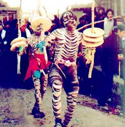 danza de tigres con locura en la plaza enfrente del templo mostrando la fiereza de los “tigres sagrados”. Sus movimientos son tan arcaicos, grotescos, vigorosos y rudos que recuerdan plenamente la danza que sus antepasados aprendieron de los qiangs antiguos. En medio de los fuertes golpes del gong y el tambor, los wutus menores brincan adelante por turno con una sola pierna, alzan los brazos, los abren y cierran a la izquierda y la derecha o los mantienen quietos. éstos son sus movimientos básicos. Los wutus se desplazan ora rápido ora lento y dan pasos grandes y peque?os dependiendo del tamboreo que hace el lawa según la necesidad y según el ánimo de los espectadores.