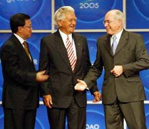 Long Yongtu, Secretario General del Foro de Boao para Asia (izq.), El anterior Primer Ministro de Australia Bob Hawke y el actual Primer Ministro de Australia John Howard (der.) se saludan a su llegada al Foro de Boao para Asia.