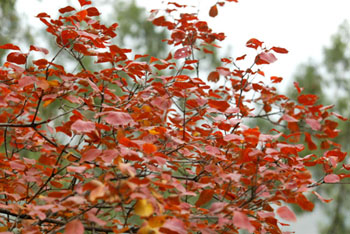 A la brisa fresca, las primeras escarchas del oto?o han vuelto las hojas de los fustetes amarillos tan rojas como los celajes que surcan el firmamento. Una veintena de variedades de árboles de follaje rojo, tales como el arce rojo de Estados Unidos, el fustete rojo de Holanda, el ciruelo y el bruno de follaje violeta, ti?en de rojo y tornan atractivas la monta?a Baiwang, las laderas de monta?a en Hongluosi y las de junto al valle Mutianyu y al lago Jinhai, situadas en los arrabales de Beijing.