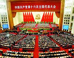 Del 8 al 14 de noviembre de 2002, el PCCh celebró su XVI Congreso Nacional, el primero en el nuevo siglo. Los nuevos Estatutos del PCCh aprobados en esta ocasión establecen el importante pensamiento de la "triple representatividad" (el PCCh debe representar siempre lo que se exige para el desarrollo de las fuerzas productivas avanzadas de China, el rumbo por el que ha de marchar su cultiva avanzada, así como los intereses fundamentales de sus masas populares más amplias) como pensamiento guía del Partido junto con el marxismo-leninismo, el pensamiento de Mao Zedong y la teoría de Deng Xiaping. El XVI Congreso Nacional del PCCh planteó el objetivo de construir en todos los aspectos una sociedad modestamente acomodada y adoptó, en torno a este objetivo, disposiciones concretas en lo económico, político, cultural y demás áreas. Eligió un nuevo Comité Central y una nueva Comisión Central de Control Disciplinario, con lo cual se cumplió el relevo del estamento directivo del PCCh.