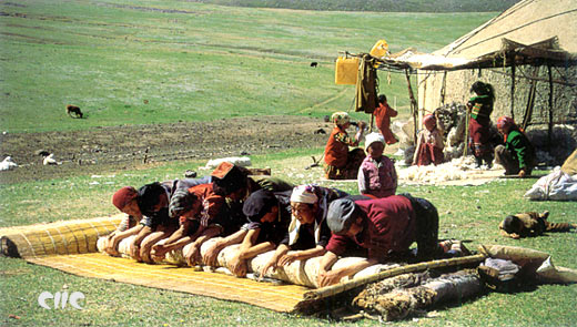 Kirguizos de la prefectura de Kizilsu golpeando tapices de fieltro para su confección