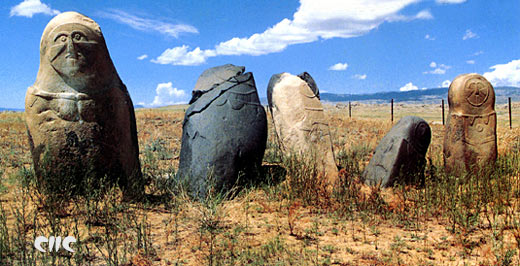 Cinco hombres de roca de Altay en una estepa al norte de las monta?as Tianshan