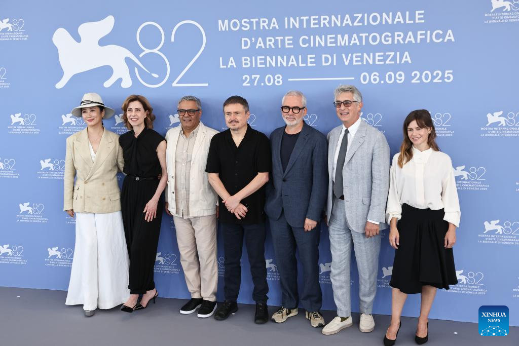 Miembros del jurado del 82.o Festival de Cine de Venecia posan en la sesión fotográfica en Venecia, Italia, el 27 de agosto de 2025. (Xinhua/Li Jing.)