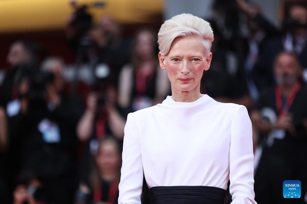 La actriz Tilda Swinton llega a la alfombra roja de la ceremonia de apertura del 82.o Festival de Cine de Venecia en Venecia, el 27 de agosto de 2025. (Xinhua/Li Jing.)