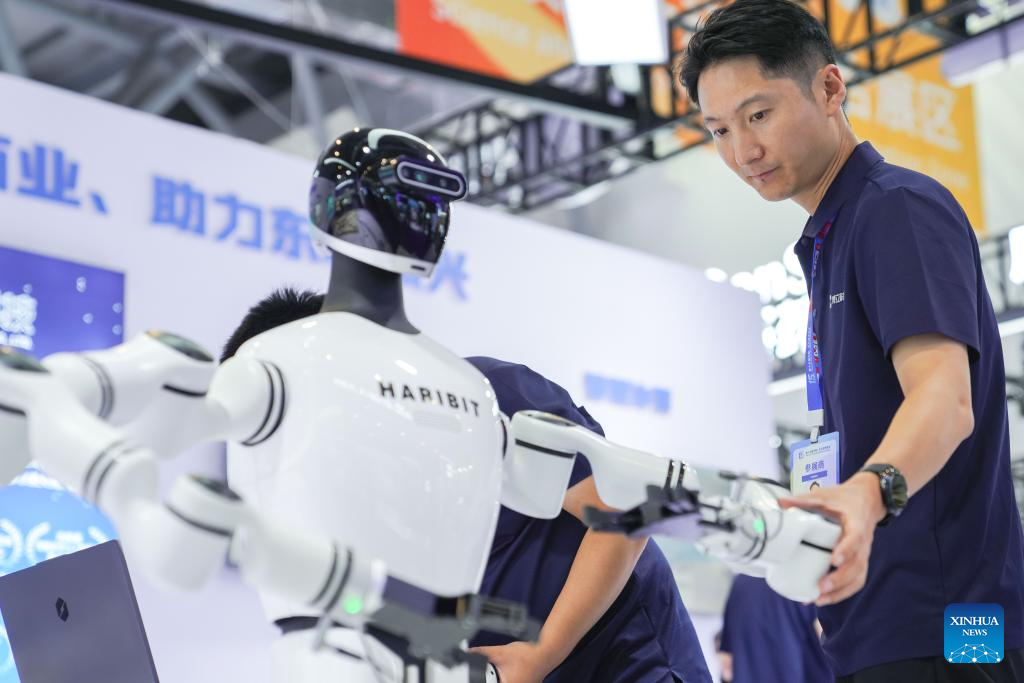 Miembros del personal ajustan un robot humanoide en la 15.a Exposición China-Noreste de Asia en Changchun, provincia nororiental china de Jilin, el 27 de agosto de 2025. (Xinhua/Xu Chang.)