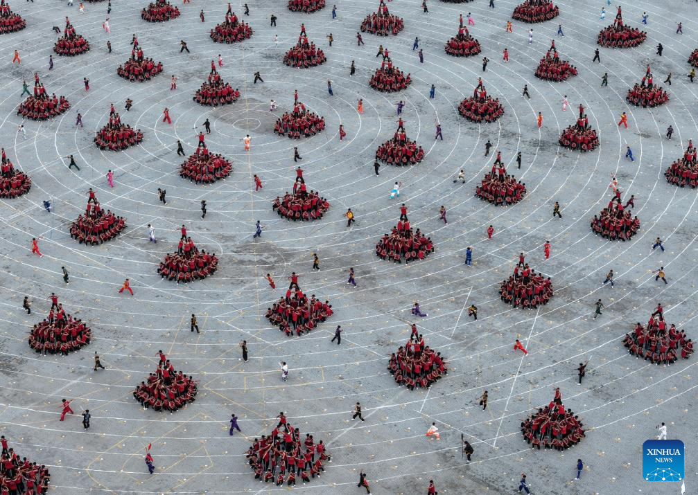 Imagen tomada con un dron el 27 de agosto de 2025 de la presentación de estudiantes de la Escuela de Artes Marciales Shaolin Tagou durante la celebración del Día Internacional del Boxeo organizada por la Asociación Internacional de Boxeo, en Dengfeng, en Zhengzhou, en la provincia de Henan, en el centro de China. (Xinhua/Li Jianan)