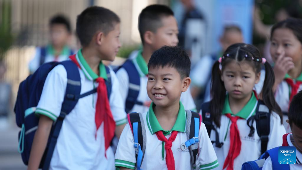 Estudiantes llegan a una escuela primaria en Guiyang, capital de la provincia de Guizhou, suroeste de China, el 1 de septiembre de 2025. El nuevo semestre para las escuelas primarias y secundarias dio comienzo este lunes en muchas partes de China. (Xinhua/Tao Liang.)