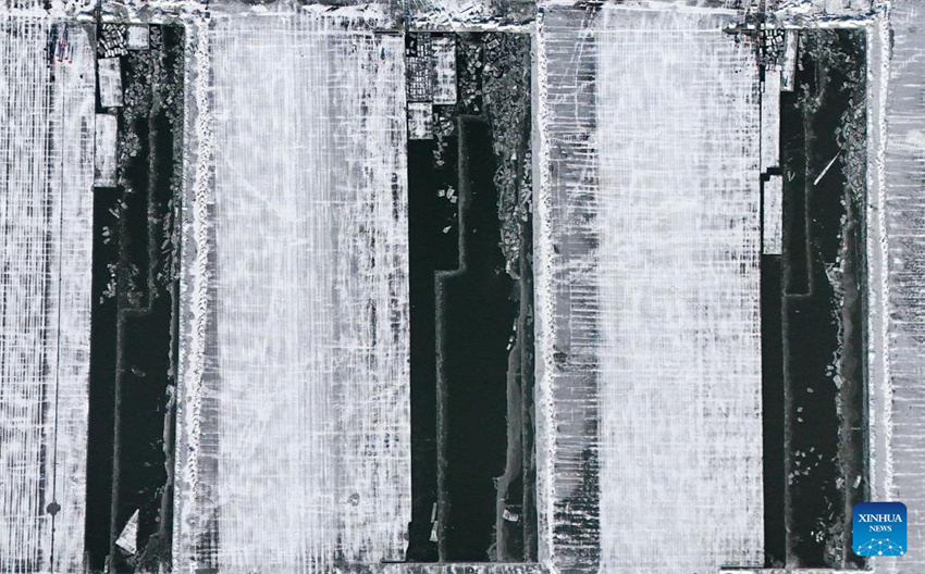 Una foto aérea tomada con un dron muestra una zona de recolección de hielo en la sección de Harbin del río Songhua, provincia de Heilongjiang, noreste de China, el 9 de diciembre de 2025. (Xinhua/Wang Song).
