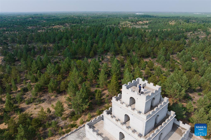 Una foto aérea tomada con un dron el 5 de junio de 2024 muestra los frondosos árboles de la base de control de la desertificación y reforestación de Maowusu, en la ciudad de Shenmu, provincia de Yulin, al noroeste de China, en la provincia de Shaanxi. (Xinhua/Shao Rui).