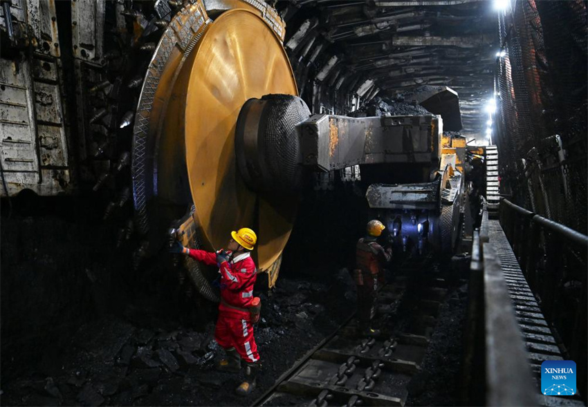 Trabajadores mantienen un sistema inteligente de corte de carbón en el frente de extracción de Shaanxi Coal Caojiatan Mining Co., Ltd. en Yulin, provincia de Shaanxi, noroeste de China, el 29 de febrero de 2024. (Xinhua/Zou Jingyi).