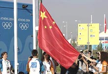China ya tiene su bandera nacional izada en la Villa Olímpica de los Juegos de Atenas 2004 antes de recibir las bendiciones del ex presidente del Comité Olímpico Internacional (COI), Juan Antonio Samaranch, que deseó muchos éxitos al equipo chino.