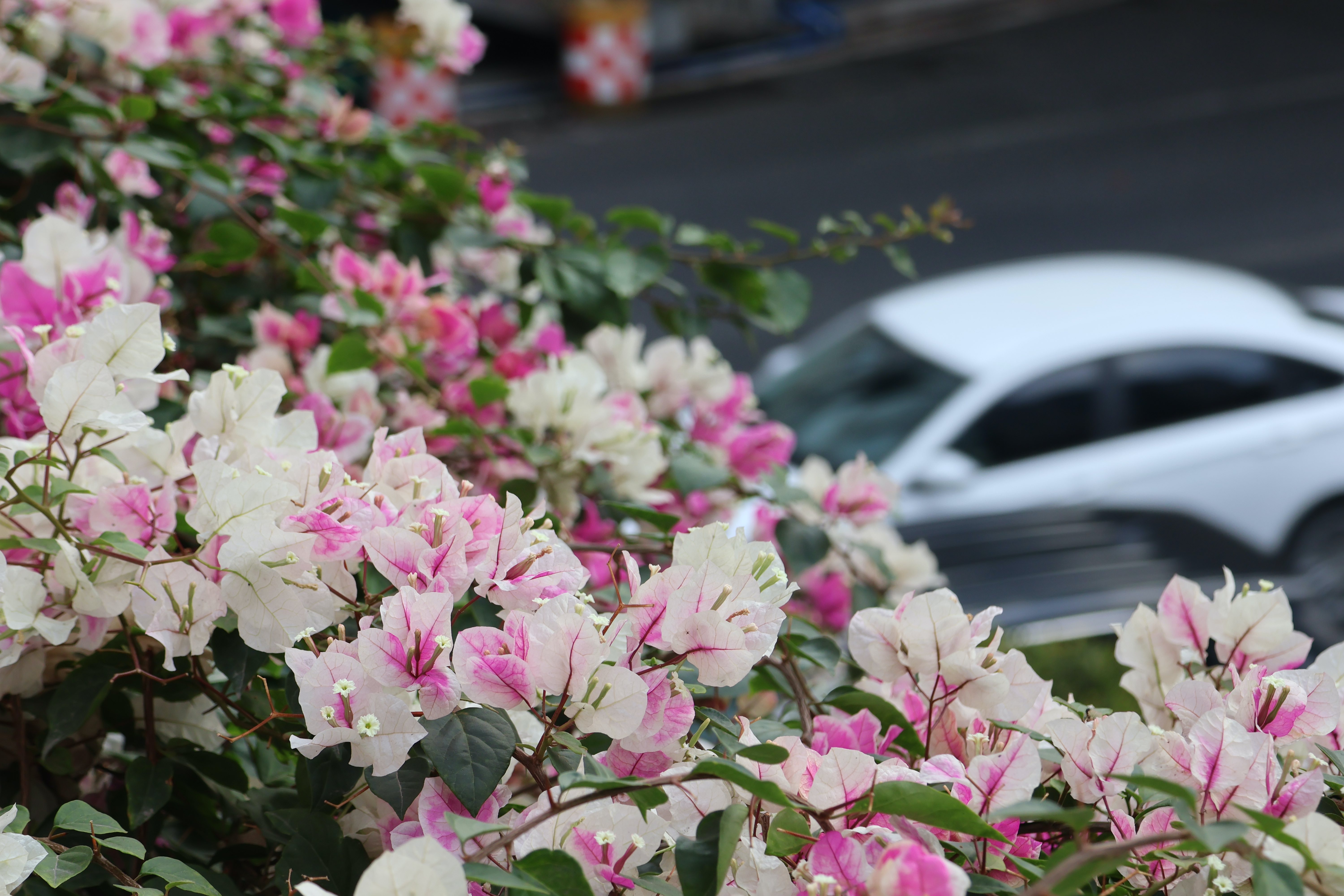 La foto muestra buganvillas rosas y blancas en el puente peatonal de la intersección de Dongfeng Middle Road y Xiaobei Road en Guangzhou, capital de la provincia meridional china de Guangdong. (Diario del Pueblo Online/He Shanfu.)