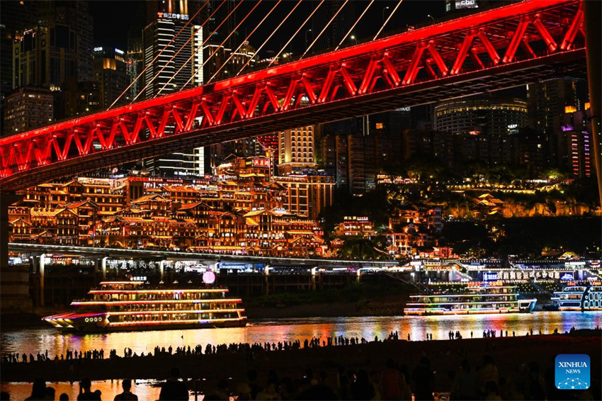 Esta foto tomada el 28 de mayo de 2025 muestra la vista nocturna de la zona panorámica de Hongyadong en Chongqing, suroeste de China. (Xinhua/Wang Quanchao.)