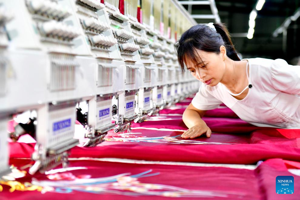 Un miembro del personal supervisa el trabajo de las máquinas de bordado en una empresa de bordado en el distrito de Caoxian, provincia oriental china de Shandong, el 19 de junio de 2025. (Xinhua/Guo Xulei.)