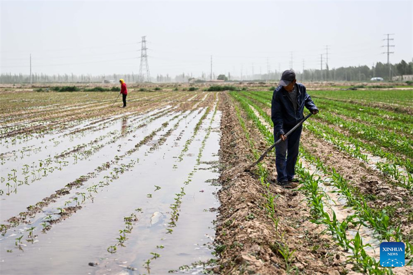 Agricultores riegan cultivos en el distrito de Linhe de Bayannur, región autónoma de Mongolia Interior, en el norte de China, el 28 de mayo de 2025. (Xinhua/Li Zhipeng.)