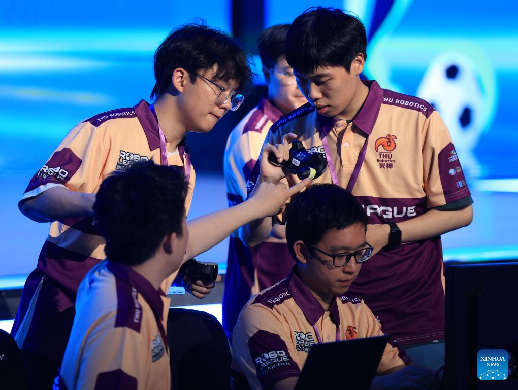 Imagen del 28 de junio de 2025 de miembros del equipo THU Robotics de la Universidad Tsinghua preparándose para un partido de fútbol de robots impulsados por IA, en Beijing, capital de China. Un partido de fútbol robot 3 contra 3, en el que todos los jugadores eran autonómos mediante inteligencia artificial, concluyó aquí el sábado. Cuatro equipos de tres universidades chinas compitieron en el partido, y el campeón fue el equipo THU Robotics de la Universidad Tsinghua. (Xinhua/Zhang Chenlin)