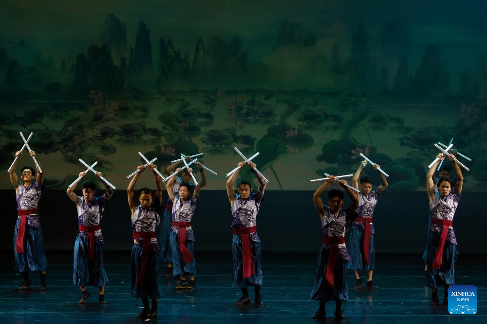 Miembros del Grupo de Artes Marciales Longyun durante una representación especial de la obra china de kung-fu y danza ?11 Guerreros? en la ópera Nacional de Bucarest para celebrar el Día Internacional del Diálogo entre Civilizaciones en Bucarest, Rumanía, el 28 de junio de 2025. (Fotografía de Cristian Cristel/Xinhua.)