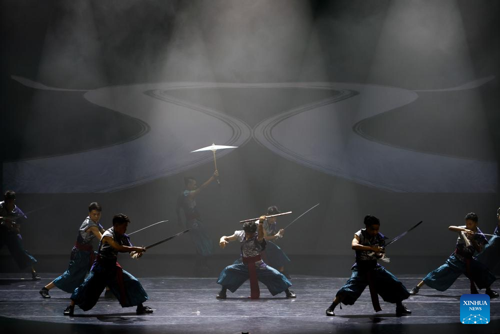 Miembros del Grupo de Artes Marciales Longyun escenifican una representación especial de la obra china de kung-fu y danza ?11 Guerreros? en la ópera Nacional de Bucarest para celebrar el Día Internacional del Diálogo entre Civilizaciones en Bucarest, Rumanía, el 28 de junio de 2025. (Fotografía de Cristian Cristel/Xinhua.)