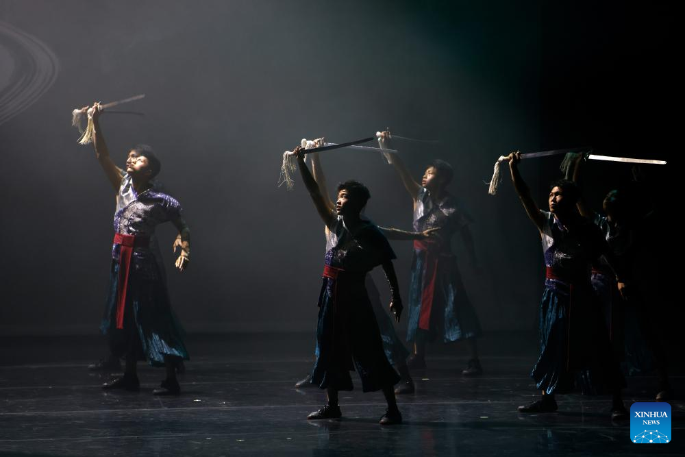 Miembros del grupo de artes marciales Longyun escenifican una representación especial de la obra china de kung-fu y danza ?11 guerreros? en la ópera Nacional de Bucarest para celebrar el Día Internacional del Diálogo entre Civilizaciones en Bucarest, Rumanía, el 28 de junio de 2025. (Fotografía de Cristian Cristel/Xinhua.)