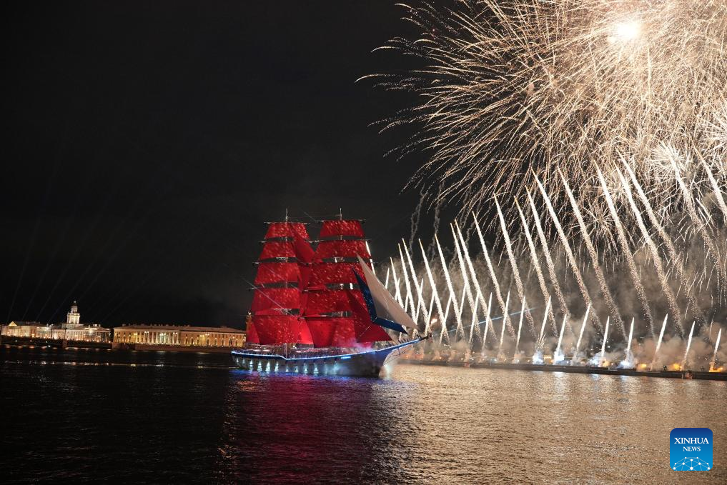 Un barco con velas escarlata se ve en el río Neva durante la celebración del festival Velas Escarlatas en San Petersburgo, Rusia, el 29 de junio de 2025. (Xinhua/An Xiaomeng.)