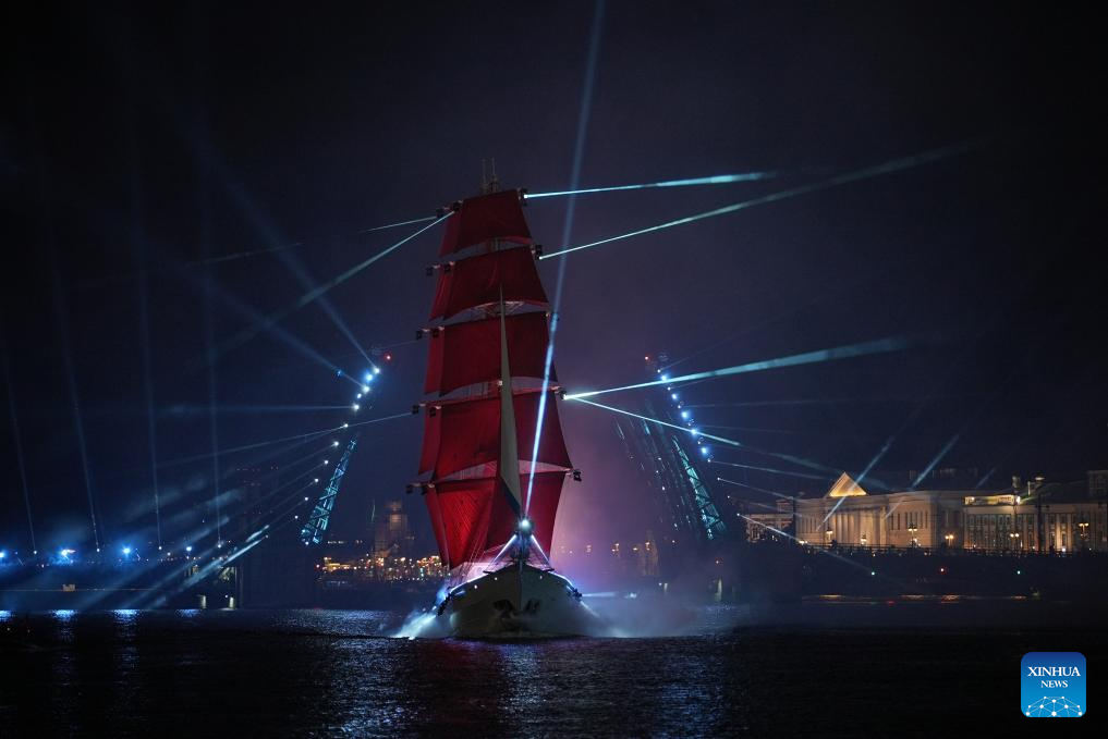 Un barco con velas escarlata se ve en el río Neva durante la celebración del festival Velas Escarlatas en San Petersburgo, Rusia, el 29 de junio de 2025. (Xinhua/An Xiaomeng.)