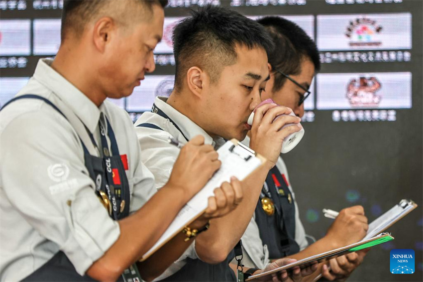 Liu Jiadi (centro) trabaja como árbitro en una competición de preparación de café en Dalian, provincia nororiental china de Liaoning, el 28 de junio de 2025. (Xinhua/Pan Yulong.)