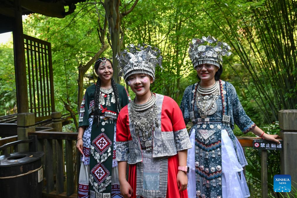Turistas portan atuendos tradicionales mientras visitan el punto escénico de Taohuayuan, en el distrito autónomo tujia y miao de Youyang, en la municipalidad de Chongqing, en el suroeste de China, el 5 de julio de 2025. (Xinhua/Chen Cheng)