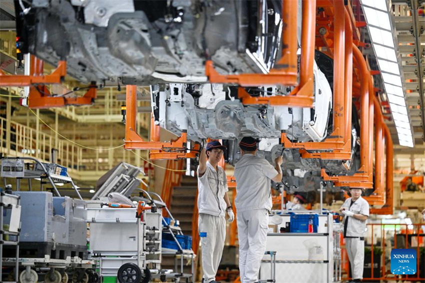 Miembros del personal trabajan en una cadena de montaje de la base de FAW-Volkswagen en el norte de China, en Tianjin, el 7 de julio de 2025. (Xinhua/Zhao Zishuo.)