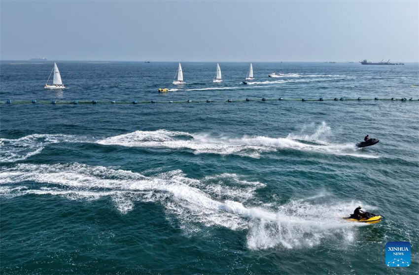 Una fotografía aérea tomada con dron el 10 de julio de 2025 muestra lanchas motoras participando en un evento náutico en la zona de la bahía de Laolong, en Qingdao, provincia oriental china de Shandong. (Xinhua/Li Ziheng.)