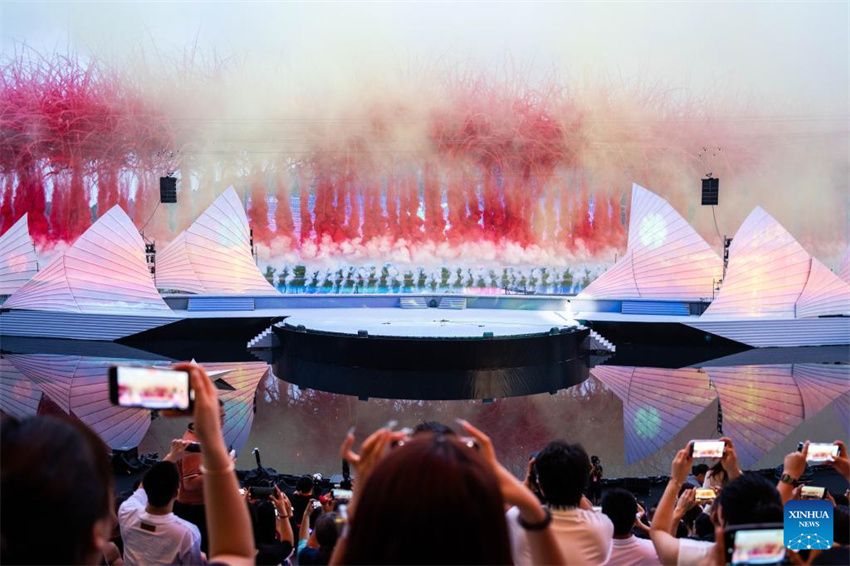Esta foto tomada el 12 de julio de 2025 muestra una escena de un espectáculo de fuegos artificiales creativos en la ciudad de Liuyang, provincia central china de Hunan. (Xinhua/Chen Sihan.)