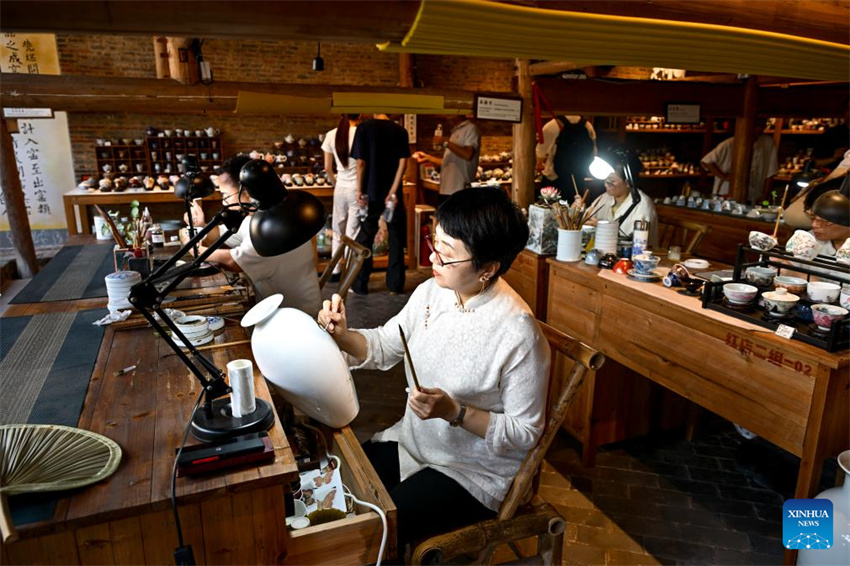Artesanos fabrican productos cerámicos en el bloque histórico y cultural de Taoyangli, en la ciudad de Jingdezhen, provincia oriental china de Jiangxi, el 13 de julio de 2025. (Xinhua/Liu Jinhai.)