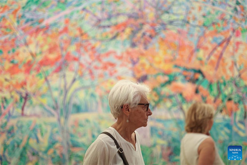 Un grupo de personas visita la exposición ?Diálogo Internacional entre Oriente y Occidente 2025: de Shanghai a Roma? en la Galería Nacional de Arte Moderno y Contemporáneo de Roma, Italia, el 14 de julio de 2025. (Xinhua/Li Jing.)