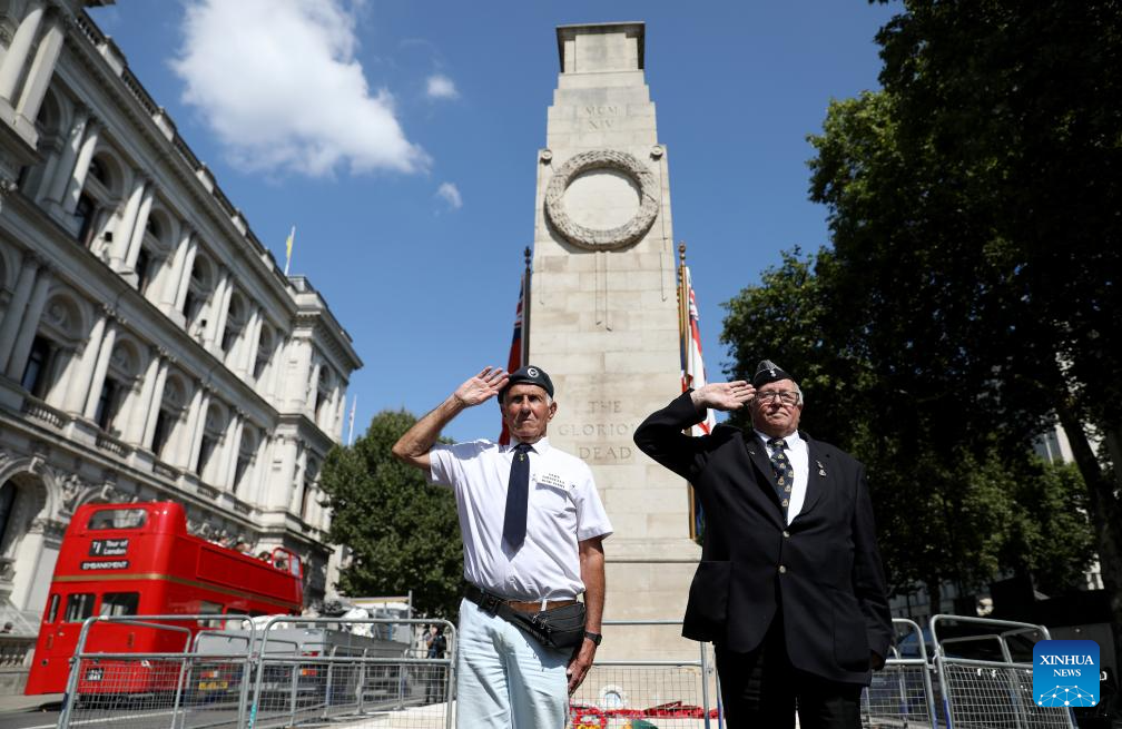 Imagen del 15 de agosto de 2025 de dos veteranos saludando frente al Cenotafio, en Londres, Reino Unido. El viernes se celebró en Reino Unido el 80° aniversario del Día de la Victoria sobre Japón con una serie de eventos. (Xinhua/Li Ying)