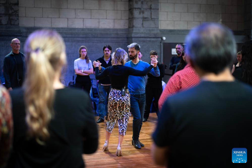 Imagen del 20 de agosto de 2025 de los bailarines, Javier Rodríguez (c-d), y Vanina Bilous (c-i), impartiendo una clase de tango durante la jornada inaugural del Festival y Mundial de Tango 2025, en el Auditorio de la Usina del Arte, en la ciudad de Buenos Aires, capital de Argentina. La capital de Argentina, Buenos Aires, comenzó a vibrar desde el miércoles con una nueva edición del Festival y Mundial de Tango 2025, actividad que tuvo su puntapié formal con actuaciones históricas de orquestas de tango, clases y exhibiciones en distintos escenarios. (Xinhua/Martín Zabala)