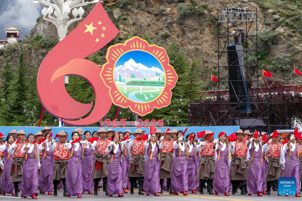 Personas participan en un desfile masivo durante una gran reunión para conmemorar el 60o aniversario de la fundación de la región autónoma de Xizang, en Lhasa, en la región autónoma de Xizang, en el suroeste de China, el 21 de agosto de 2025. Unos 20.000 funcionarios locales y personas de todos los grupos étnicos y todos los ámbitos de la sociedad se unieron en la celebración. (Xinhua/Tenzing Nima Qadhup)