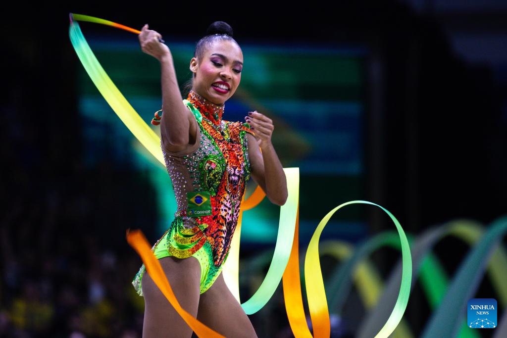 Imagen del 22 de agosto de 2025 de Geovanna Santos, de Brasil, compitiendo en el evento de cinta de las finales del concurso completo individual durante el 41 Campeonato Mundial de Gimnasia Rítmica de la FIG, en Río de Janeiro, Brasil. (Xinhua/Claudia Martini)