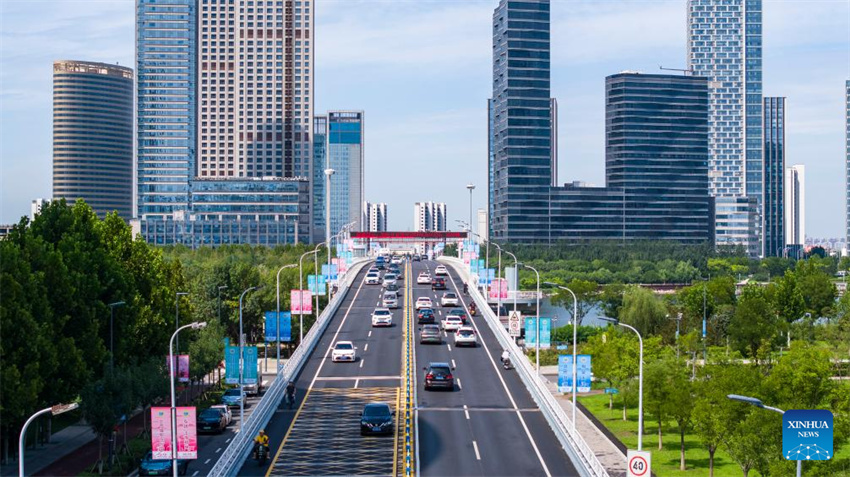 Una foto tomada con un dron el 22 de agosto de 2025 muestra postes de luz adornados con pancartas que informan de la próxima Cumbre de la OCS 2025 en la Nueva área de Binhai, en Tianjin, norte de China. (Xinhua/Zhao Zishuo.)