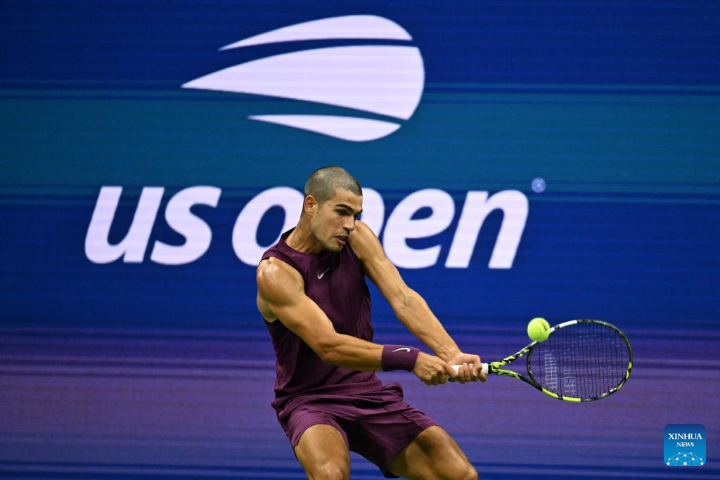 Imagen del 25 de agosto de 2025 de Carlos Alcaraz, de Espa?a, devolviendo la pelota durante el partido de primera ronda de individuales masculinos, ante Reilly Opelka, de Estados Unidos, en el campeonato de tenis US Open 2025, en Nueva York, Estados Unidos. (Xinhua/Li Rui)