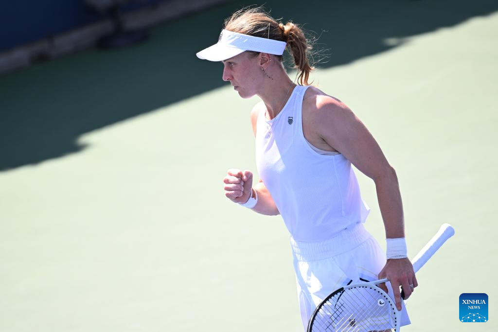 Imagen del 25 de agosto de 2025 de Liudmila Samsonova, de Rusia, reaccionando durante el partido de primera ronda de individuales femeninos, ante Yuan Yue, de China, en el campeonato de tenis US Open 2025, en Nueva York, Estados Unidos. (Xinhua/Li Rui)