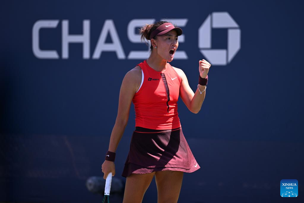 Imagen del 25 de agosto de 2025 de Yuan Yue, de China, reaccionando durante el partido de primera ronda de individuales femeninos, ante Liudmila Samsonova, de Rusia, en el campeonato de tenis US Open 2025, en Nueva York, Estados Unidos. (Xinhua/Li Rui)