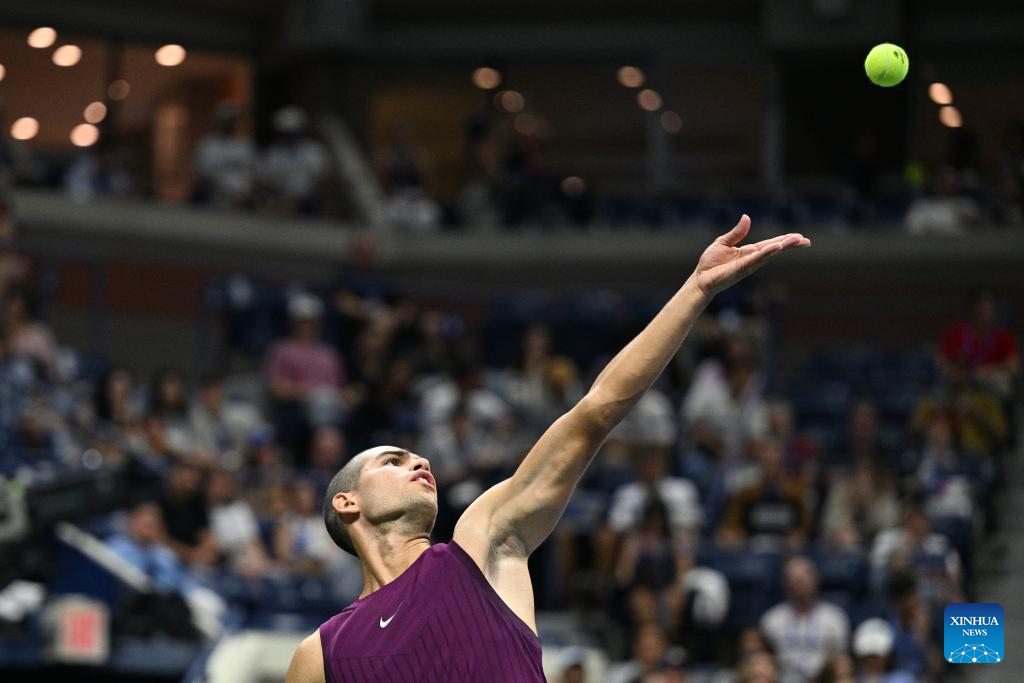 Imagen del 25 de agosto de 2025 de Carlos Alcaraz, de Espa?a, sirviendo la pelota durante el partido de primera ronda de individuales masculinos, ante Reilly Opelka, de Estados Unidos, en el campeonato de tenis US Open 2025, en Nueva York, Estados Unidos. (Xinhua/Li Rui)