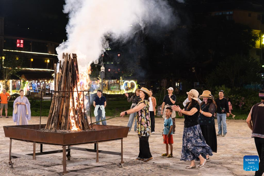Turistas asisten a una fiesta de hogueras en la aldea de Bamei del distrito de Guangnan, en la prefectura autónoma de las etnias miao y zhuang de Wenshan, provincia de Yunnan, suroeste de China, el 24 de agosto de 2025. (Xinhua/Gao Yongwei.)