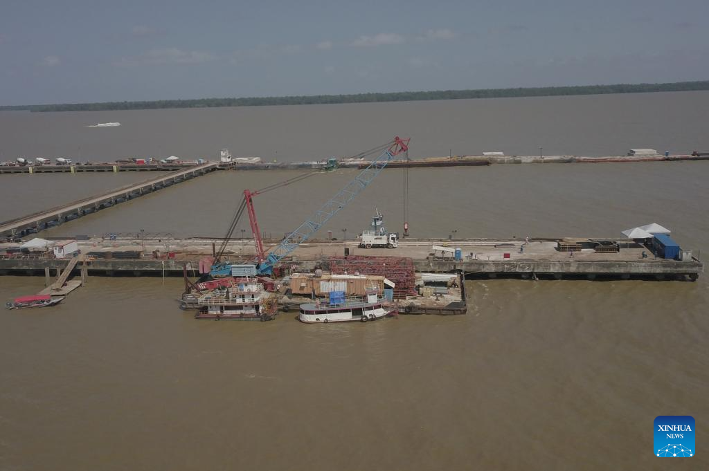 Vista aérea tomada por un dron el 27 de agosto de 2025 del sitio de construcción de un nuevo puerto para el atraque de buques que servirán como hoteles durante la Conferencia de las Partes (COP30) de la Convención Marco de las Naciones Unidas sobre Cambio Climático, en Belém, estado de Pará, Brasil. (Xinhua/Lucio Tavora)