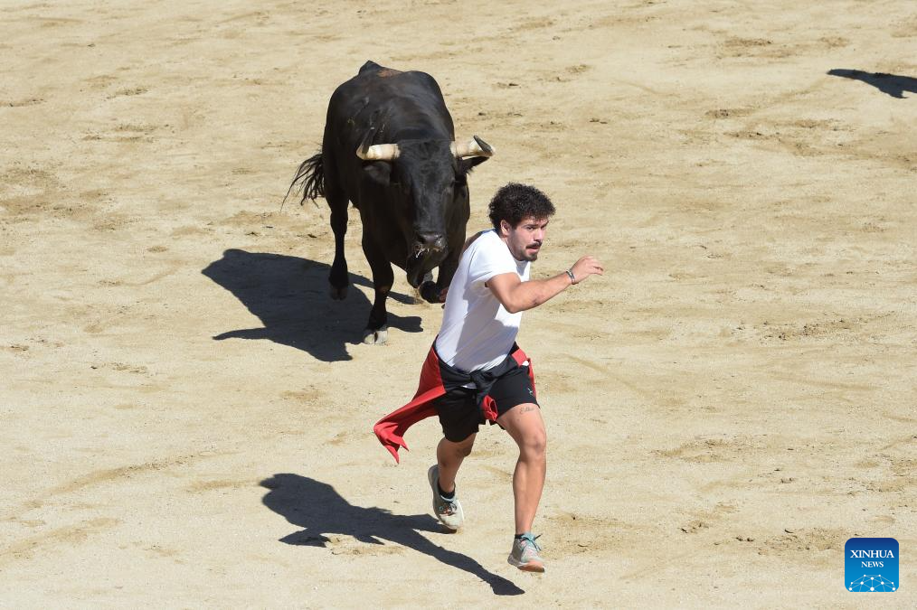 Imagen del 28 de agosto de 2025 de un toro persiguiendo a un hombre en una plaza de toros, en San Sebastián de los Reyes, Espa?a. La fiesta anual de los encierros se celebra aquí la última semana de agosto. (Xinhua/Gustavo Valiente)