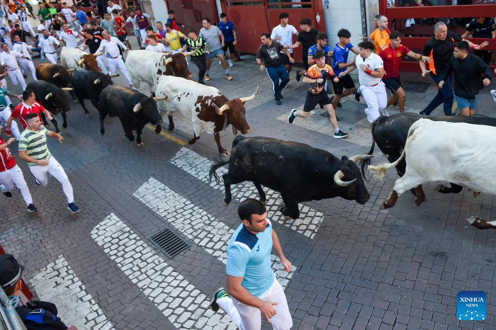 Imagen del 28 de agosto de 2025 de personas asistiendo al encierro en una calle, en San Sebastián de los Reyes, Espa?a. La fiesta anual de los encierros se celebra aquí la última semana de agosto. (Xinhua/Gustavo Valiente)