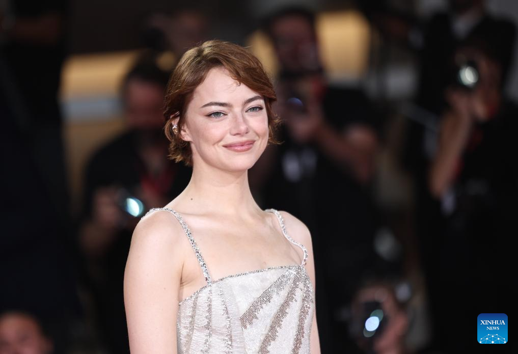 Imagen del 28 de agosto de 2025 de Emma Stone posando para una fotografía en la alfombra roja previo al estreno de la película "Bugonia" durante el 82° Festival de Cine de Venecia, en Venecia, Italia. (Xinhua/Li Jing)