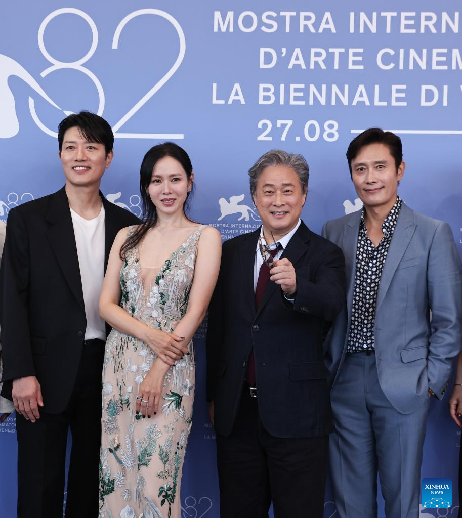 El reparto principal de la película "No Other Choice" posa para una sesión fotográfica durante el 82° Festival de Cine de Venecia, en Venecia, Italia, el 29 de agosto de 2025. (Xinhua/Li Jing)
